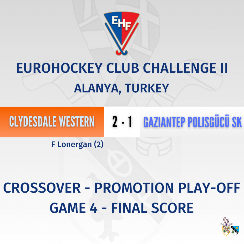 Clydesdale Western secured promotion to EuroHockey Club Challenge I for next year after completing their Club Challenge II campaign with a fantastic hard fought Promotion Play-Off win over Turkish side Gaziantep Polisgücü on Monday afternoon.