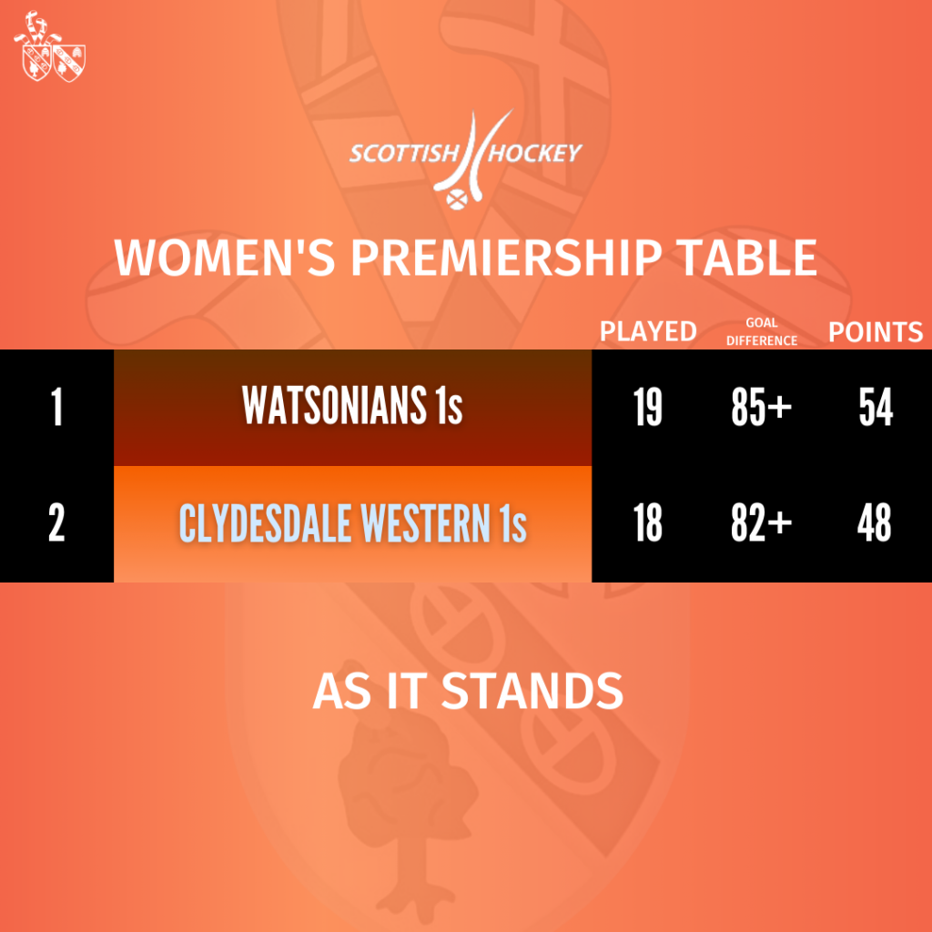 A win on Thursday and a win next Tuesday coupled with favourable scoring returns could see the Titwood girls take top spot going into the final game of the season away to GHK on Saturday 30th April. On the other hand, a win for Watsons on Thursday night would win the league title for the Myreside club. A draw would not mean the Edinburgh side clinch top spot, but would most likely have one hand on the league trophy as ‘Dale Western would face an improbable task of having to win their remaining two league games with a goal difference return above two and hope Watsonians lose their final game to Edinburgh Uni.