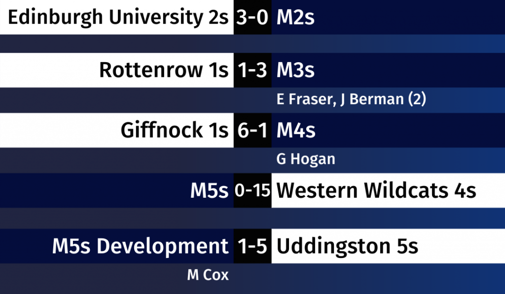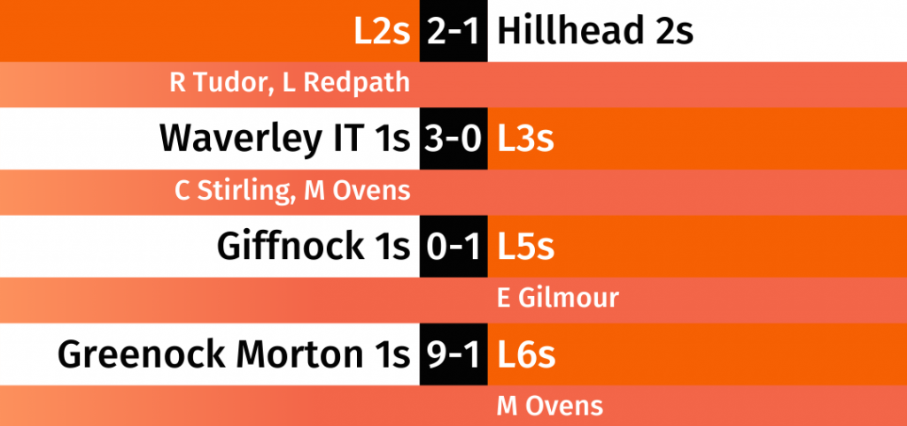 In the same division, M5s Development had a day to forget after being thrashed 15-0 at home to Western Wildcats 4s. The L6s will have felt in similar vain following a 9-1 loss to Greenock Morton 1s in Women’s West District Division Three. Melanie Ovens providing the merest of consolation goals.