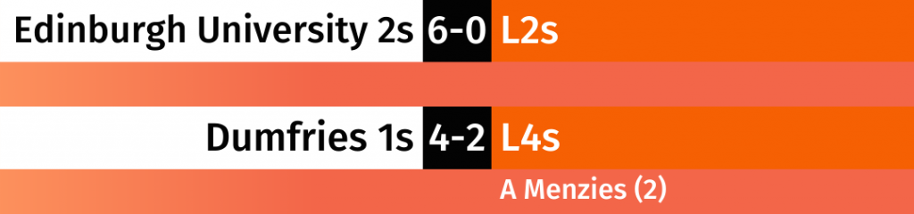 Sticking with Saturday, the L4s completed their season in Women’s West District Division One with a 4-2 loss away to Dumfries 1s. Ann Menzies scored both goals in the first half for the visitors. Meanwhile, the L2s had a difficult afternoon in the A Division of the Women’s Championship, losing 6-0 to champions Edinburgh University 2s at Peffermill.