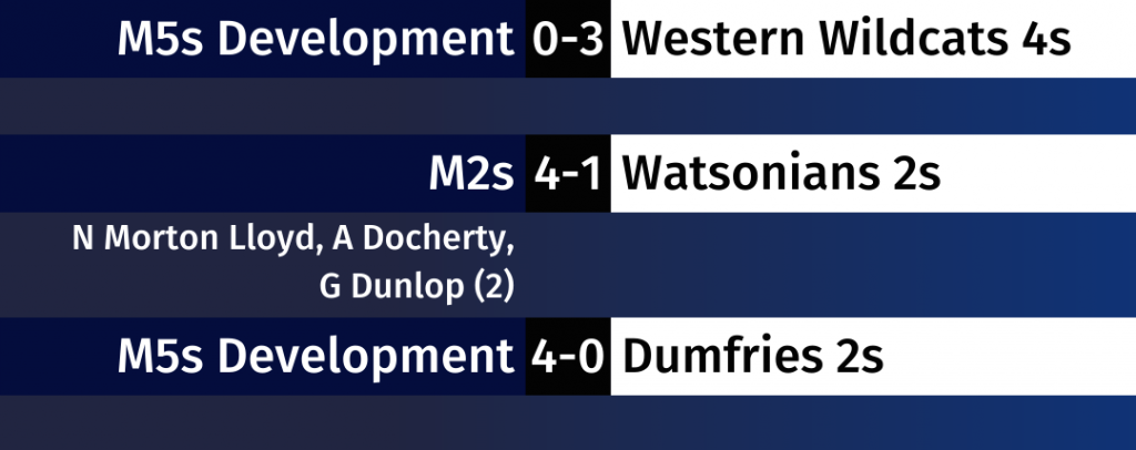 Earlier in the day at Titwood, the M5s Development won 4-0 against Dumfries 2s. Iain Flynn got the first two goals before David Mitchell marked his debut with a goal. Jack Wallace completed the scoring in the Men’s West District Division Three contest. The 4-0 win for the M5s Development was a recovery from the previous day’s 3-0 loss against Western Wildcats 4s.