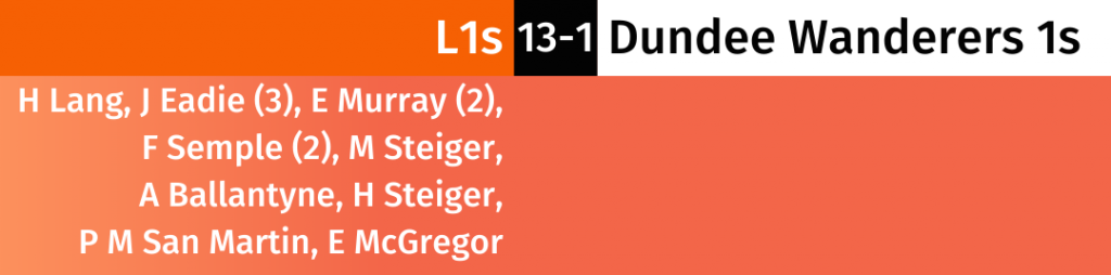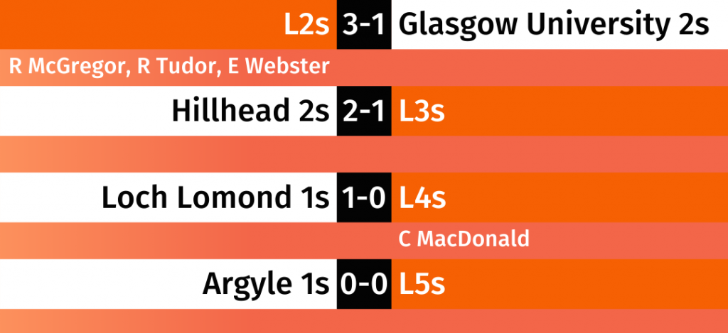 The L2s got their challenge in the Women’s Championship back on track as a goal each from Rhona McGregor, Rosie Tudor and Emma Webster gave Donald Amour’s side a 3-1 win at home to Glasgow University 2s. No such luck for the L3s in the same division, who – despite a goal from Claire MacDonald – went down 2-1 to Hillhead 2s at Upper Windyedge.