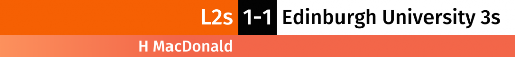 The L2s and M2s suffered losses against respective Edinburgh University sides. The L2s, at Hutchesons’ Grammar School, lost 2-1 to Edinburgh Uni 3s. Hannah MacDonald’s goal five minutes from time was merely a consolation to a two-goal lead that was initially gained by Uni 3s. The M2s signed off their Men’s Regional Division season, losing 6-0 to Edinburgh Uni 2s at Peffermill in a result that confirmed the student side’s place as league champions.