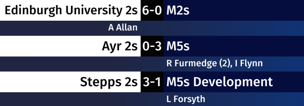 Two goals from Ross Furmedge and one from Iain Flynn helped the M5s record a 3-0 win against Ayr’s 2nd XI. Meanwhile, the M5s Development lost 3-1 away to Stepps 2s. Logan Forsyth’s powerful reverse strike cancelled out a Stepps opener. But the home side grabbed a goal in both halves without reply to take all three points.