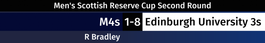 No such luck for the M4s on Saturday in the Men’s Scottish Reserve Cup Second Round either. Despite a stunning goal from veteran Russell Bradley, the M4s were beaten 8-1 at home to Men’s Regional Division side Edinburgh University 3s.
