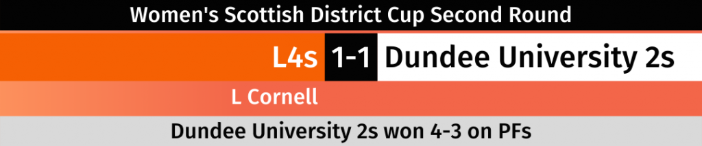 And Sunday completed the bad luck of cup games, as the L4s were knocked out of the Women’s Scottish District Cup in the typically cruel fashion of penalty flicks against Dundee University 2s. At home on a wet and soggy afternoon, the student side took the lead just before halftime. But the Titwood girls were level not long into the second half with a lovely finish from Lily Cornell to complete the game’s scoring all the way to full time. The shootout sadly finished 4-3 in favour of Dundee University 2s however.