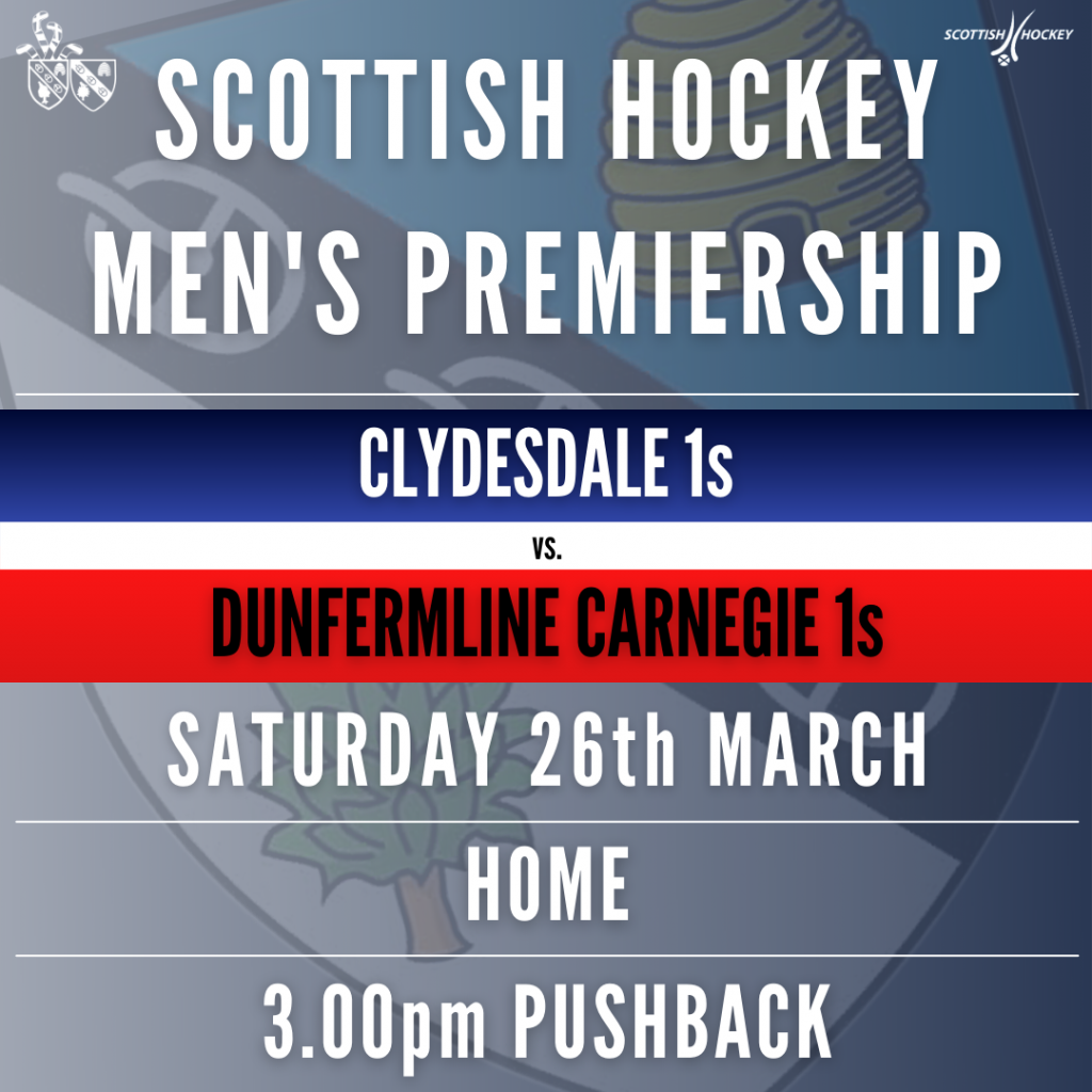 Clydesdale 1s bid for a high finish in the Men’s Premiership continues when they host Dunfermline Carnegie 1s from 3.00pm at Titwood on Saturday.