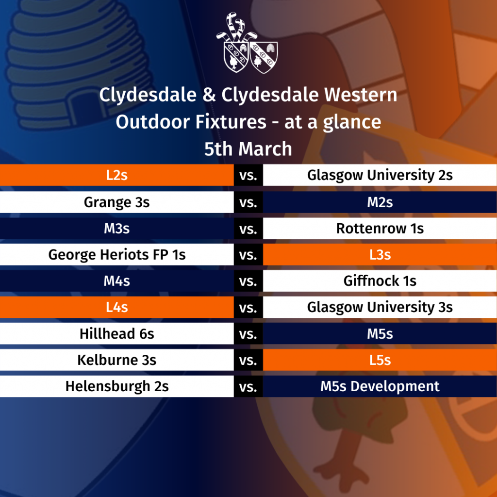 From the Saturday games alone, the schedule begins with the M4s at Titwood in Men’s West District Division Two against Giffnock 1s from 12.00 noon. The M5s and M5s Development both have away games in Men’s West District Division Three against Hillhead 6s (2.00pm) and Helensburgh 2s (12.45pm) respectively.